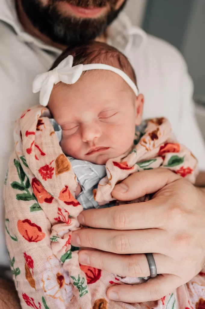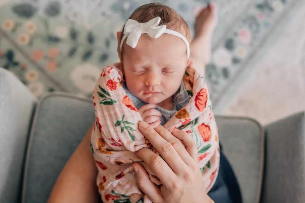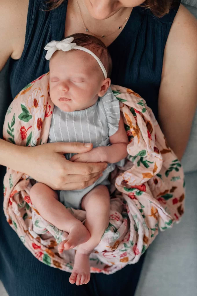 When it comes to outfits, less is more. A soft onesie, a favorite swaddle blanket, or even just a diaper is often perfect. Simple clothing keeps the focus on your baby’s expressions, tiny fingers, and all those little details you never want to forget in your newborn pictures in your home.